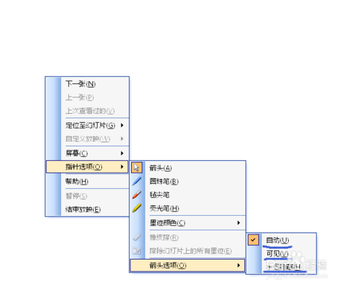 5、出现3个选项,分别为自动,可见,永远隐藏。其中自动指鼠标三秒不动则自动隐藏,可见则是鼠标保持显示状态,永远隐藏则是鼠标永远隐藏