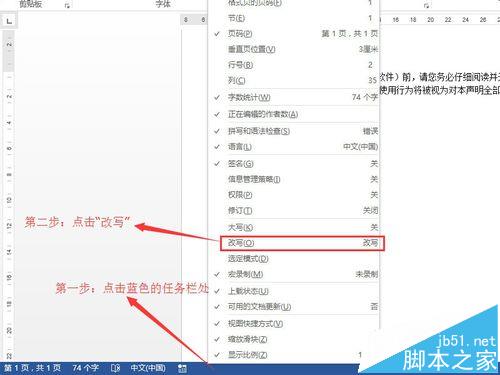 2、通过修改来让状态栏中显示当前的模式。首先在word2013底部的状态栏中点击右键。在弹出来的菜单点击“改写”。