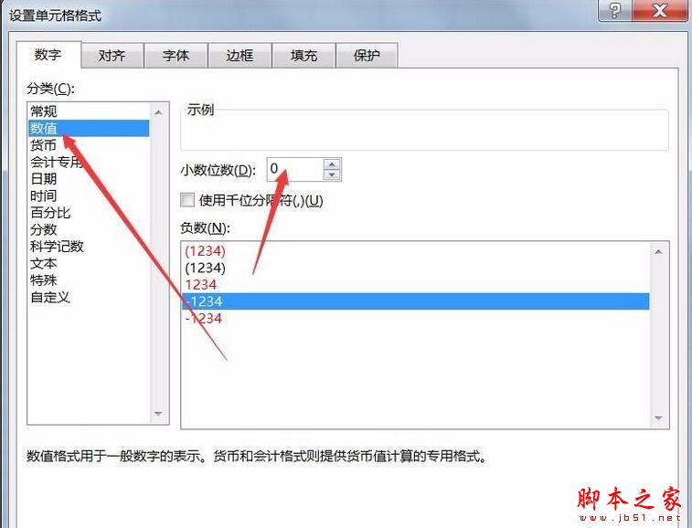 选择数字选项卡,并选择数值,小数位数为0,点击确定。
