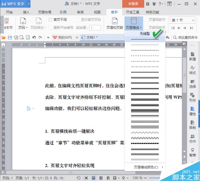 在WPS中打开含有页眉的文档,通过“章节→页眉横线”,从中选择“无线型”,即可去掉页眉中的横线。