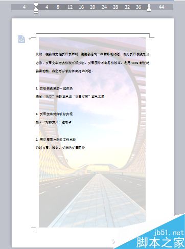 如果要实现跨越版心,覆盖页眉、页脚的水印图片,可借助于页眉设置来完成。双击页眉进入页眉页脚设置,点击“插入图片→来自文件”按钮菜单命令,选择一张背景图片插入;然后通过“布局选项”的“文字环绕”列表,选择“衬于文字下方”;拖动图片的四个边角,将图片缩放到超出版心的任意位置。这样就实现了背景水印图片的“出血”编排。如果要实现背景图片的透明,可在选中图片后选择“颜色”菜单下的“冲蚀”效果。
