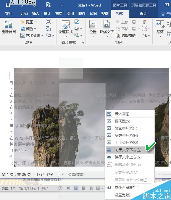 Word 2016中同样选择“文字环绕”为“衬于文字下方”,然后调整大小位置设置等即可。