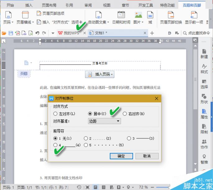 在页眉中输入内容后要进行居中或居右,常见人们用输入多个空格的方法将页眉内容向右顶排。实际上,在WPS页眉页脚的设置窗口中,通过“插入对齐方式选项卡”按钮,呼出“对齐制表位”对话框,在其中可方便地选择页眉的左中右对齐方式、对齐基准参照;此外,还有四种前导符可选,这样就省去了在需要前导符时,反复手动输入横线或点号的重复劳动。