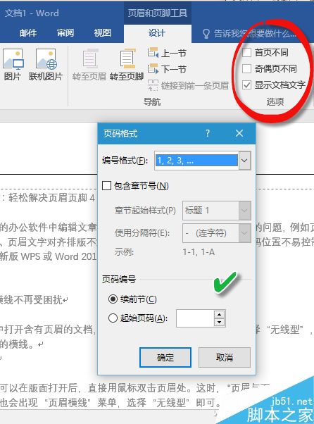 Word 2016中如上设置的选项位于“设计”菜单的“选项”分组下,进入页眉页脚一眼就能看到。