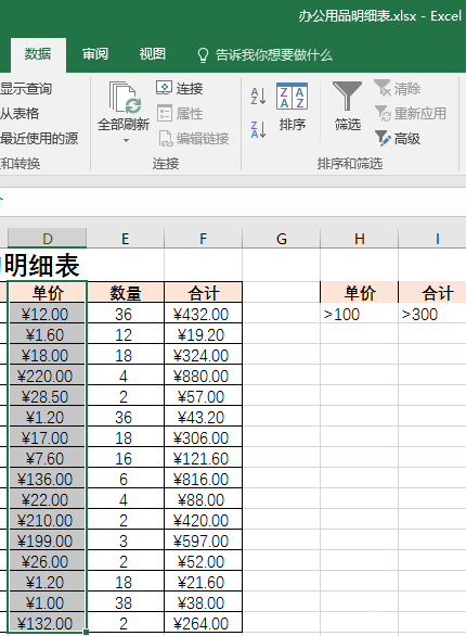 如果想看符合单价大于100并且总价大于300的那些项目,操作方法同上,只是在选取数据的时候,列表区域要全选单价和合计部分的数据(为了选取方便,可以将数量部分一并选中),条件区域全选设定的单价和合计部分就可以啦。