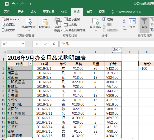 假设已有一个公司办公用品采购的明细表。现在需要快速将那些单价超过100元的,或者总价超过300元的办公用品项目找出来。