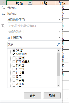 点击下拉箭头按钮,其中已自动提取出这一列中的数据选项了。如果我们只想看复印纸购买了多少,那么去除其他选项,只勾选复印纸这项。