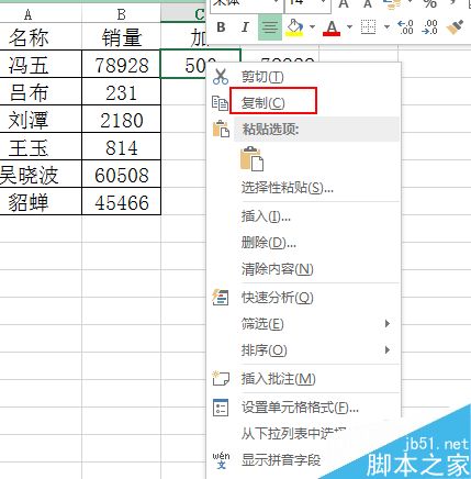 4、选中右侧复制的销量,右键-选择性粘贴。