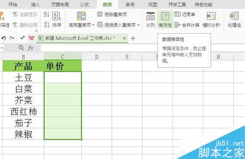 2、选定需要输入单价的所有单元格。在工作栏中,选择数据-有效性,有效性就是对单元格进行条件限制,防止输入无效的数据。