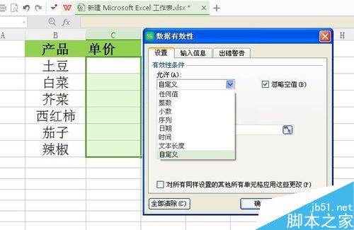 3、在数据有效性对话框中,有效性条件选择自定义。