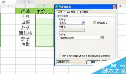 4、公式中输入=isnumber(C2),可以直接点击C2单元格选中,就是需要输入单价的第一个单元格。