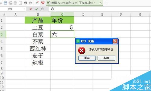 6、现在在单价列中输入数字5,没有问题,当输入汉字六的时候,跳出警示框,提示重新输入数字,这样就有效地限制单元格只能输入数字。