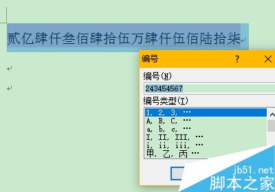 3、单击编号按钮后,弹出一个编号对话框,里面罗列了很多编号类型,我们选择汉字大写的那个。