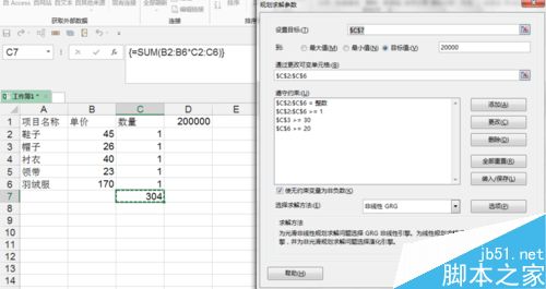 6、最后就是对这个问题的一种约束条件。比如说这里的所有商品都为整数,且都至少买一件,还有羽绒服至少买20件,帽子30个等等,看我们怎么来做的。选择【添加】。
