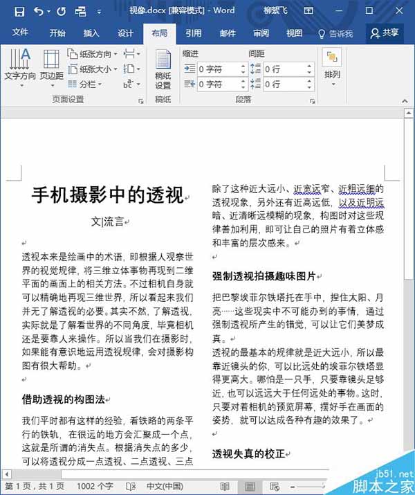 从下拉菜单中选择“两栏”后,可以看到整个文档已经自动分栏了,版面美观了很多。而且在本例中,本来显示为共2页,现在版面压缩成了1页。