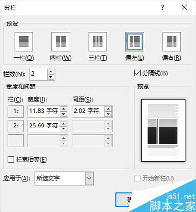 除了两栏外,我们还可以选择三栏、偏左、偏右等选项。点击分栏下拉菜单中的“更多分栏”,在打开的分栏对话框中,我们还可以对分栏进行更精细的调整。在这里,可以设置栏间距的大小,可以设置左右分栏的各自大小,勾选“分隔线”还可以添加栏间线。
