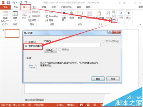 1、打开PPT文件,依次点击“插入”>“对象”>“由文件创建”>“浏览”。