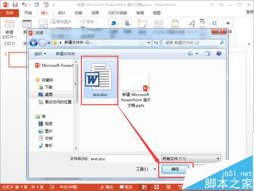 2、从浏览对话框中选择需要插入的文件,然后点击“确定”。