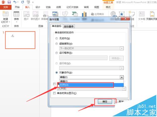 6、从对象动作列表中的选择“打开”,然后点击“确定”。