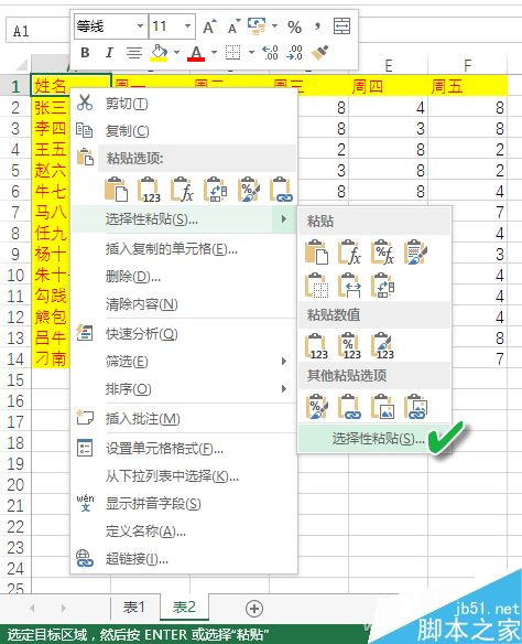 接下来切换到表2,将光标定位到第一单元格,然后右键单击并依次选择“选择性粘贴→选择性粘贴”。
