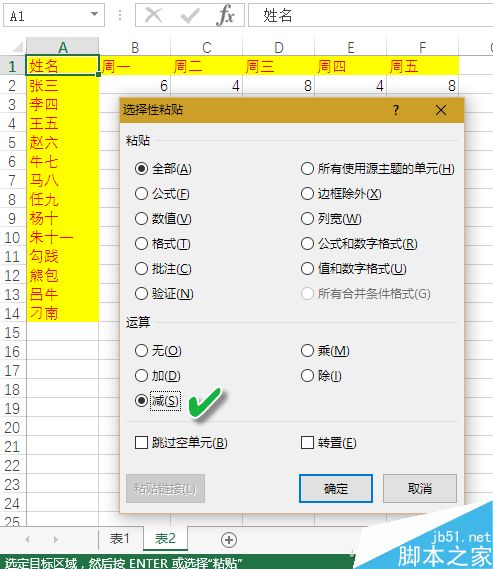 在随后弹出的选项窗口中,将运算类型选择为“减”,点击“确定”。