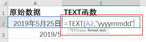 如图,公式=TEXT(A2,”yyyymmdd”)将“2019年5月25日”转化为文本“20190525”。公式=TEXT(A2,”yyyy年m月”)将“2019年5月25日”转化为文本“2019年5月”。