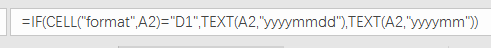 公式=IF(CELL("format",A2)="D1",TEXT(A2,"yyyymmdd"),TEXT(A2,"yyyymm")),先判断单元格的日期格式,若单元格具体到日期,则转化为“20190525”格式的文本,否则转化为“201905”格式。