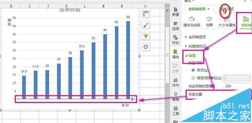 5、设置横坐标箭头。点击横坐标→右侧出现设置窗口→“坐标轴选项”→“填充与实线”→“线条”→“实线”→“颜色”→“黑色”;→“末端箭头”→选如图所示→“坐标轴”→“标签位置”→无