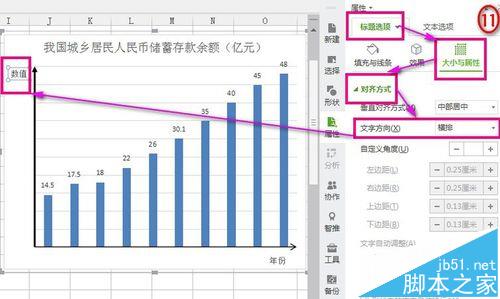 7、更改纵坐标轴标题“数值”为横向点击纵坐标标题→右侧出现设置窗口→“轴标题选项”→“大小与属性”→“对齐方式”→“文字方向”→“横排”。