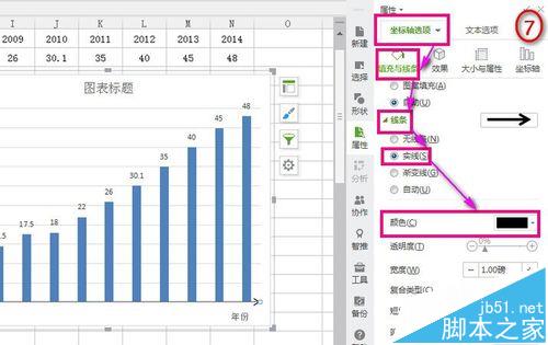 6、设置纵坐标坐标箭头。点击纵坐标→右侧出现设置窗口→“坐标轴选项”→“填充与实线”→“线条”→“实线”→“颜色”→“黑色”;→“末端箭头”→选如图所示→“坐标轴”→“标签位置”→无【仿照横坐标设置】