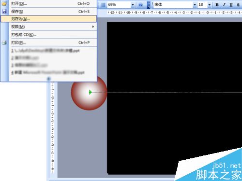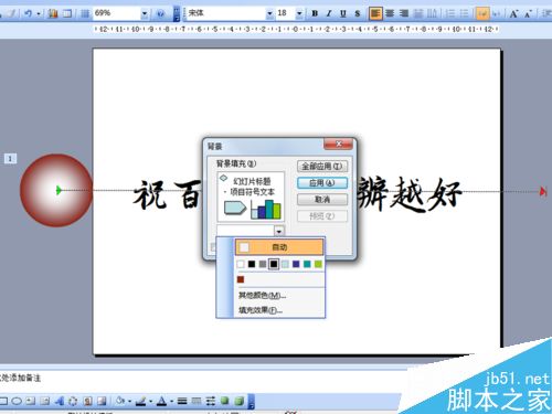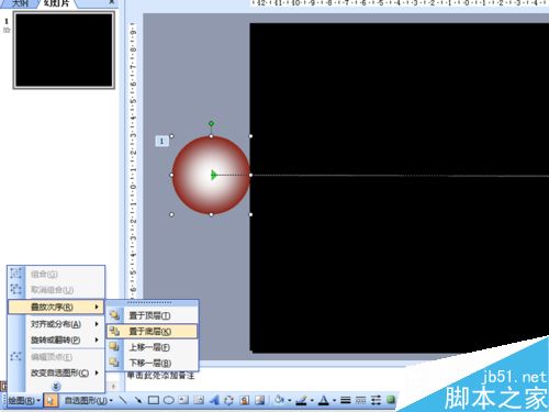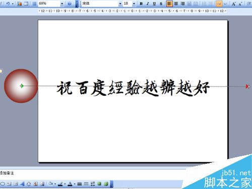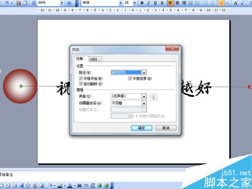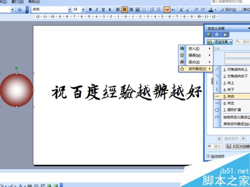 4、调整正圆的位置至文字左边,并且放置在幻灯片外部,选择正圆,执行幻灯片放映-自定义动画-动作路径-向右命令。