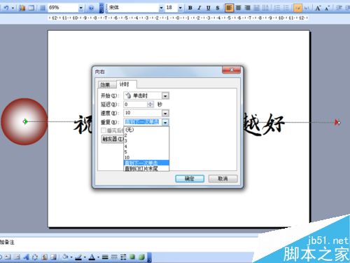 6、在自定义动画对话框中设置向右属性对话框,在计时选项卡中设置速度为10秒,重复选择直到下一次单击。