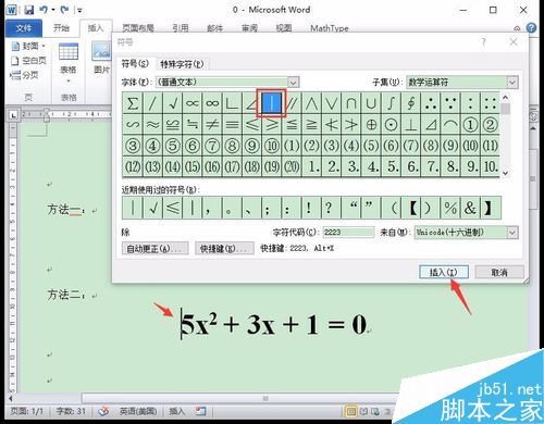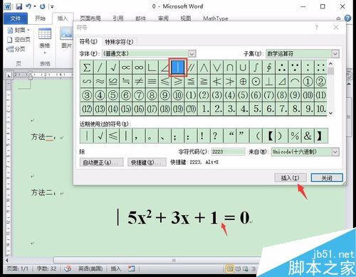 3、接着,用鼠标点击需要插入绝对值符号的位置,将光标移动到那儿,选中“竖线”符号,并点击“插入”按钮,即可完成绝对值符号的插入。