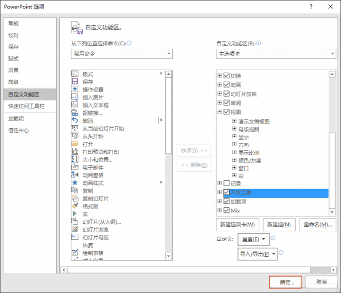 使用PowerPoint 2016的朋友,如果没有显示“开发工具”选项卡,请先点击“文件→选项”打开选项对话框,点选左侧“自定义功能区”,再在右侧选中“开发工具”,确定即可。
