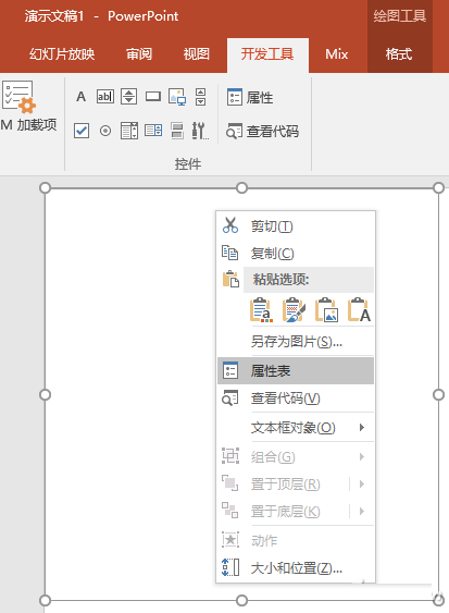 接下来切换到“开发工具”选项卡,点击工具栏上的文本框ActivX控件按钮(带ab符号的图标),然后在幻灯片上画出一个文本框控件。右击控件框,从右键菜单中选择“属性表”。