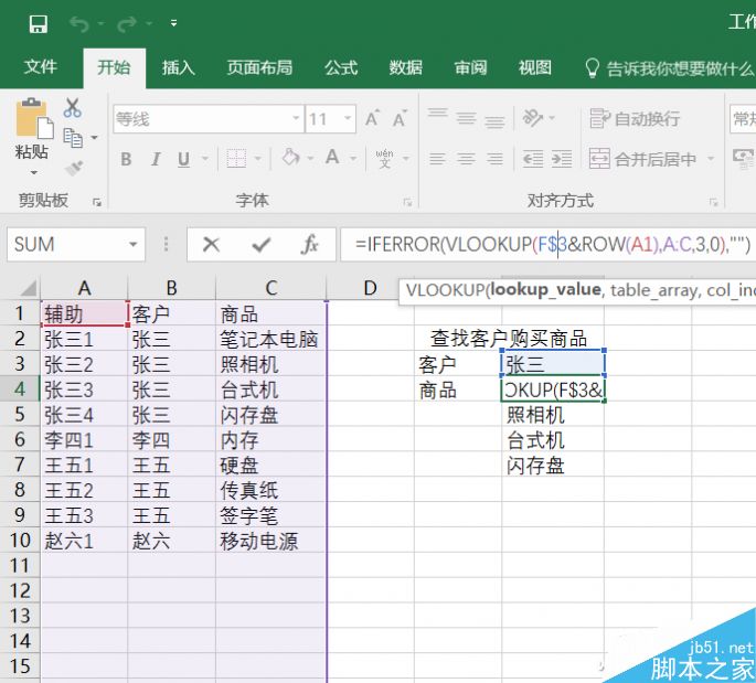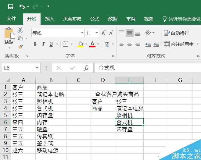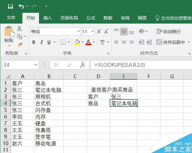 比如在下表中,我们在E3单元格上输入函数=VLOOKUP(E3,A:B,2,0),只能提取出张三购买的第一个商品。