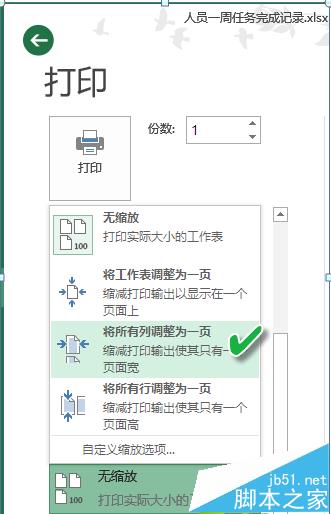 2、其实,这时候我们只需从打印设置窗口中,把缩放选择列表中的选项调整为“将所有列调整为一页”,这样打印时就不会分开两页或更多页打印了。总体速度也提升了