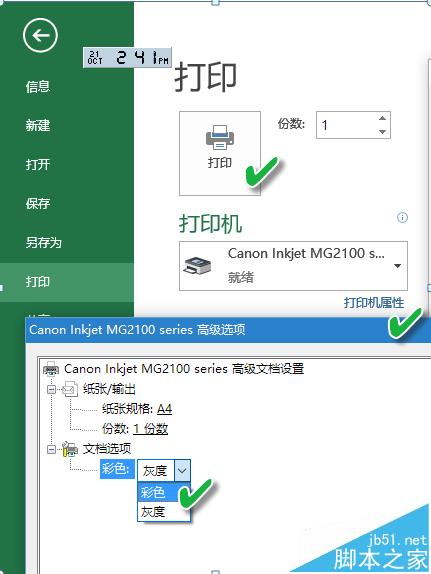 4、如果黑白打印会丢掉某些图案细节,那么可改为“灰度”打印。在打印设置窗口中,通过设置“打印机属性”,点击“高级”按钮进入“高级选项”设置窗口,可将文档选项从“彩色”改选为“灰度”,则可以