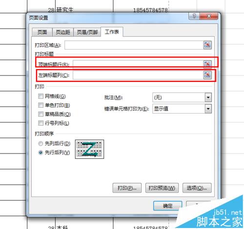 4、如下图中,打开的打印标题设置页面中,工作表中有两项。其中【顶端标题行】指的是设置打印顶端的标题,顶端标题指的是打印出来之后在纸张头部的数据。当然可以指定excel的前几行,或者指定中间的几行。当指定中间几行数据时,第一页按照excel中的数据展示,从第二页开始,纸张头部将打印选定的几行。【左侧标题行】指的是重复左侧的列,此处需列数超过纸张范围时列方向的多页才会重复打印。