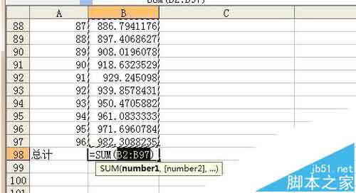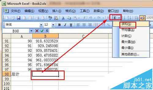 2、在右边的单元格,也就是B98单元格,我们点击工具栏上的求和工具