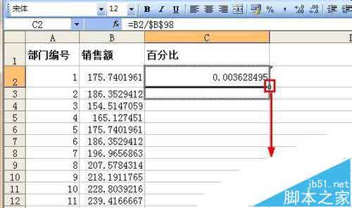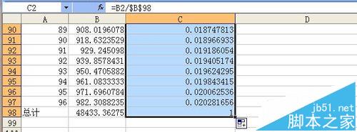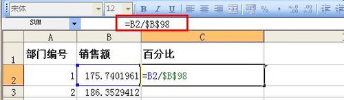 6、在C2单元格,输入公式 =B2/$B$98 ,这个公式中运用了符号$,这是“固定不变的意思”,也就是说,一会我们要复制C2内的公式到别的单元格,别的单元格会根据复试的位置改变公式中的变量,加上符号$以后,变量就不变了。如刚刚输入的公式,B2是一个变量,是会改变的,但是B98这个就不变了。B98是刚才得到的销售总额。