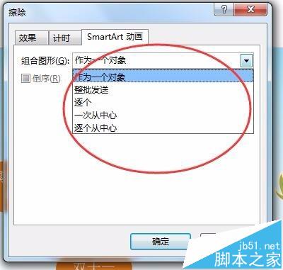 5、在弹出的窗口中,切换到“SmartArt动画”,然后点击“组合图形”右侧的下拉箭头,会出现诸如“作为一个对象”等选项,缺省状态就是作为一个对象;