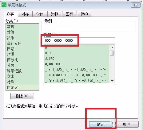 4、在右侧的文本框中输入代码:000 0000 0000,这里的每一个0都代表着一个数字,最后点击确定完成操作。