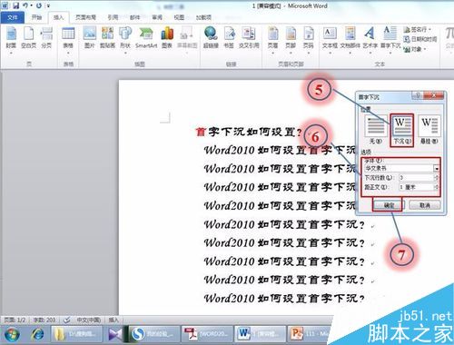 4、弹出【首字下沉】菜单,选中【下沉】按钮,然后设置【选项】组中的参数,包括【字体】、【下沉行数】和【距正文】,最后点击【确定】。
