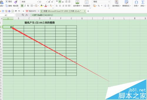 2、下面介绍随机产生1至100之间的整数:选中A2单元格,在编辑栏中输入公式“=INT(RAND()*100+1)”,如图所示;