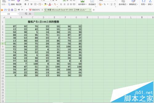 6、按“ctrl+v”粘贴,空白表格中实现随机产生1至100之间的整数,如图所示;