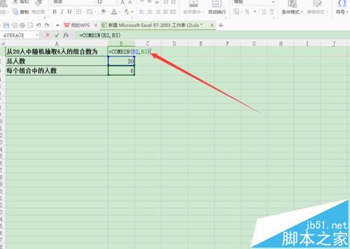 2、选中B1单元格,在编辑栏中输入公式“=COMBIN(B2,B3)”(B2表示:总人数20,B3表示:每个组合中的人数6),如图所示;