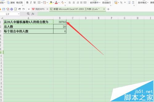 3、在输入公式完毕后,按回车键,计算出“从20人中随机抽取6人的组合数”,如图所示;
