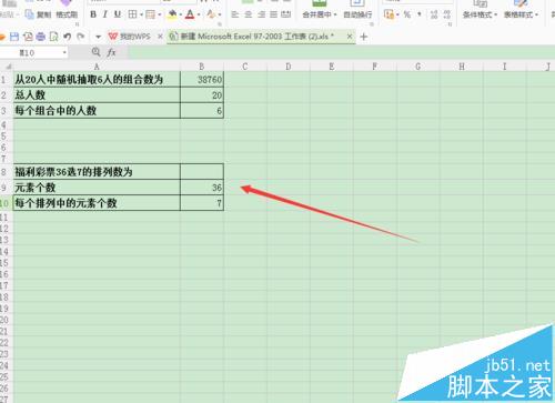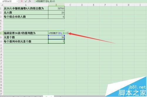 5、选中B8单元格,在编辑栏中输入公式“=PERMUT(B9,B10)”(B9表示:元素个数36,B10表示:每个排列中的元素个数7),如图所示;