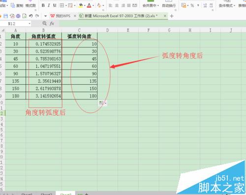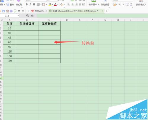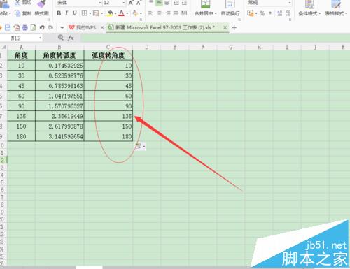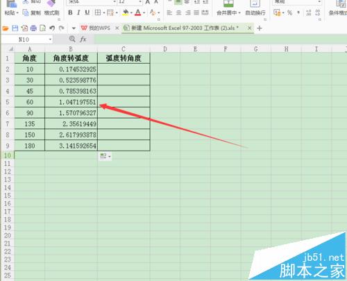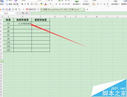 8、把鼠标放到B2单元格的右下角,直到看到“+”字星,在出现“+”字星后,按住鼠标左键并向下拖动鼠标,这时就会实现由弧度转换为角度的效果,如图所示;
